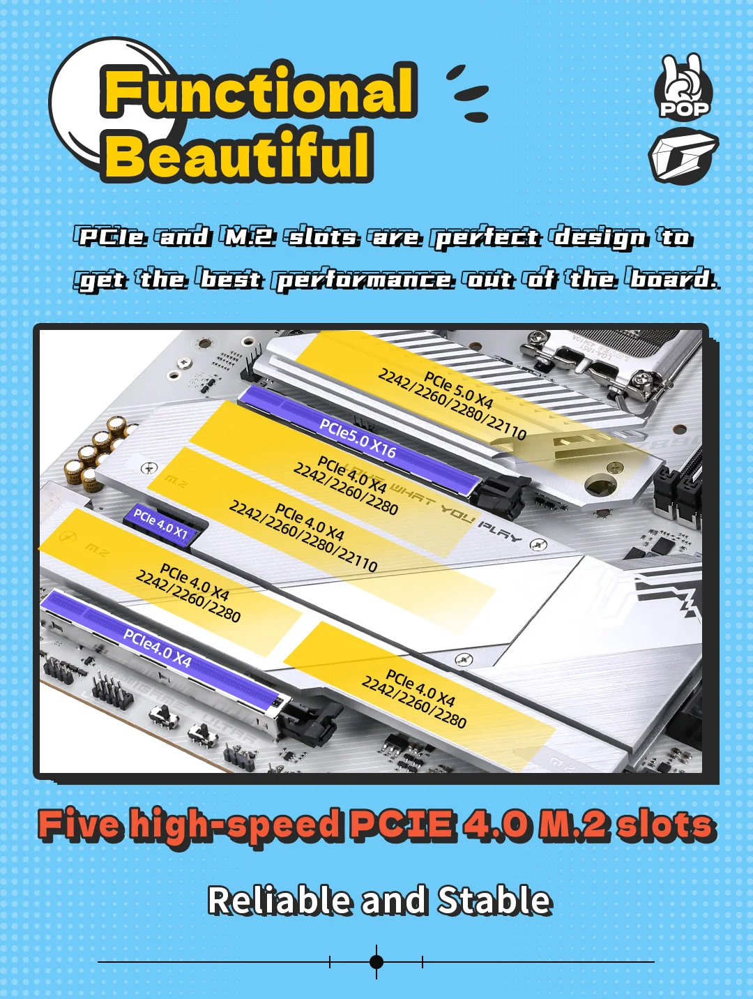 PCIe ve M.2 yuvaları, karttan en iyi performansı almak için mükemmel bir tasarıma sahiptir.Beş adet yüksek hızlı PCIE 4.0 M.2 yuvasına sahiptir.
