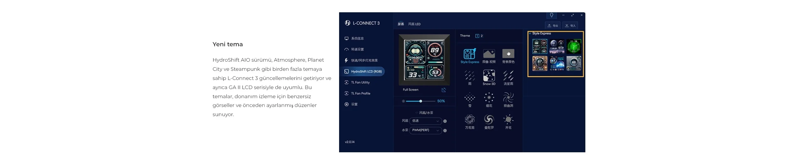 HydroShift AIO sürümü, Atmosphere, Planet City ve Steampunk gibi birden fazla temaya sahip L-Connect 3 güncellemelerini getiriyor ve ayrıca GA II LCD serisiyle de uyumlu. Bu temalar, donanım izleme için benzersiz görseller ve önceden ayarlanmış düzenler sunuyor.