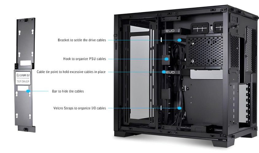 O11D EVO, çift bölmeli tasarım ve çıkarılabilir braket ile kullanıcının sistemlerini kabloyla yönetme becerisini optimize eder.