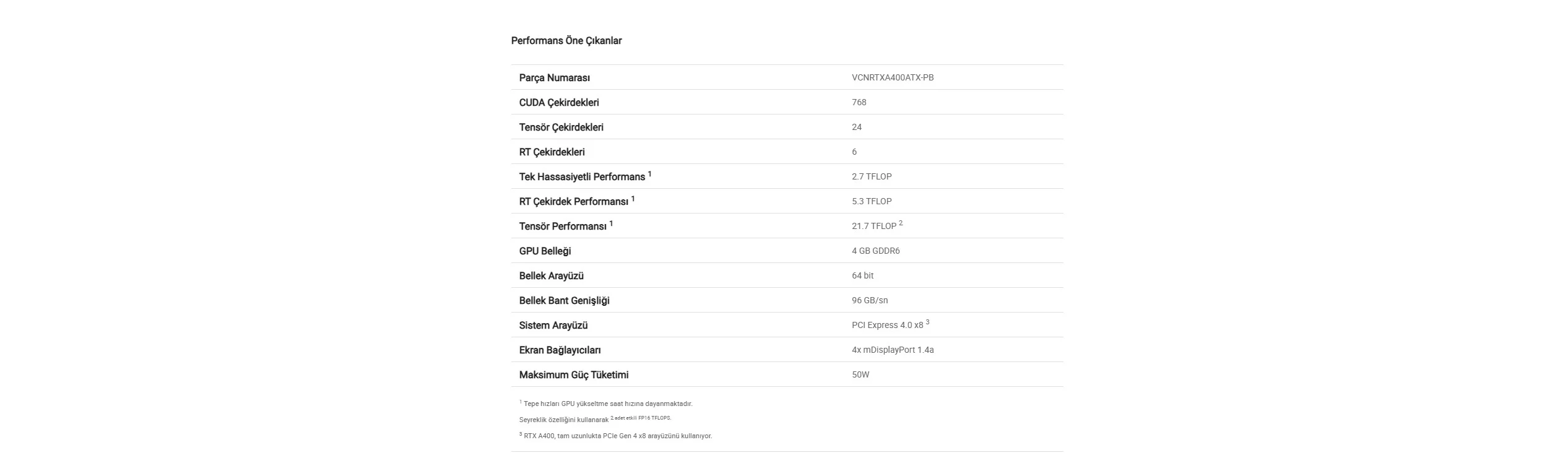 PNY NVIDIA A400 4GB GDDR6 mDP 64Bit (VCNRTXA400-PB) Genel Özellikler