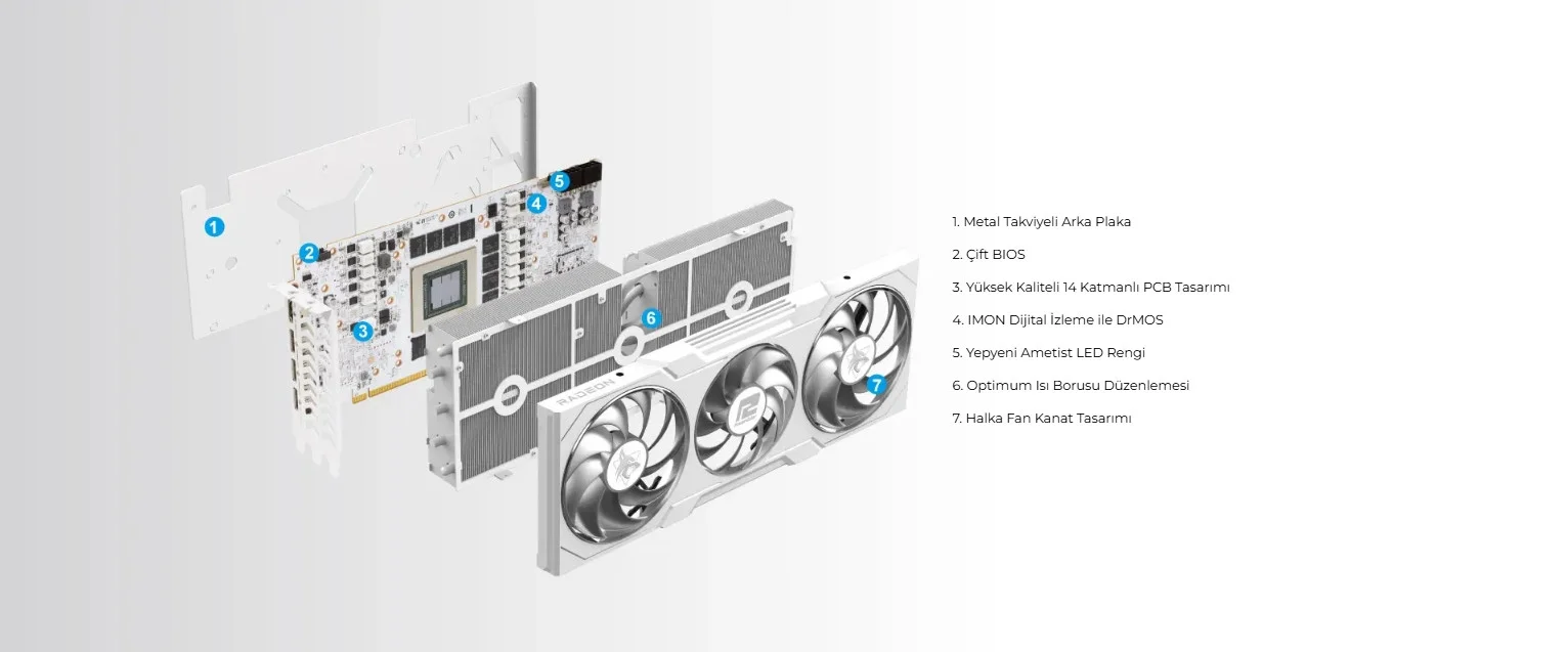 RX 7900 XT Hellhound Spectral White Edition, grafik kartları dünyasında tasarımın zirvesi. Tamamen beyaz PCB ve soğutucuya sahip olup, şık bir estetik sunar. Bu kart, her oyun kurulumunun görünümünü yükseltecek bir merkez parça.