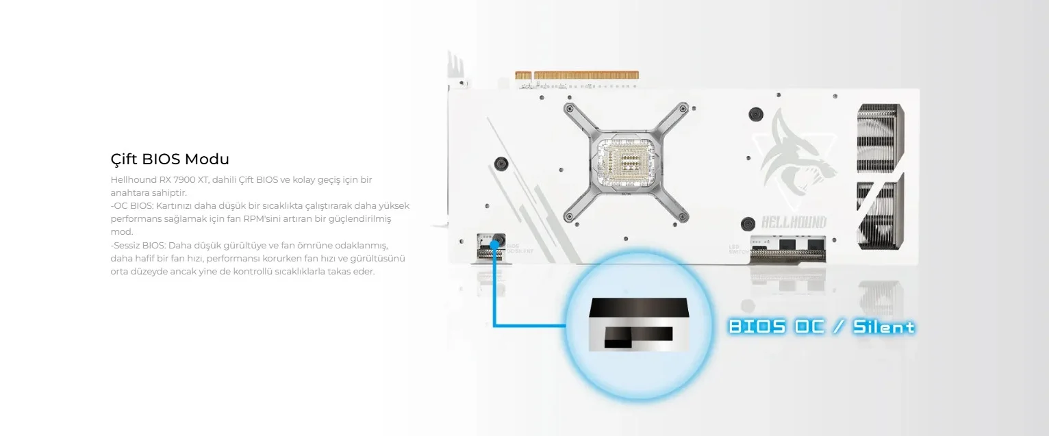 Hellhound RX 7900 XT, dahili Dual BIOS'a ve kolay geçiş için bir anahtara sahip.-OC BIOS: Daha yüksek performans ve düşük sıcaklık için fan RPM'ini artırır.