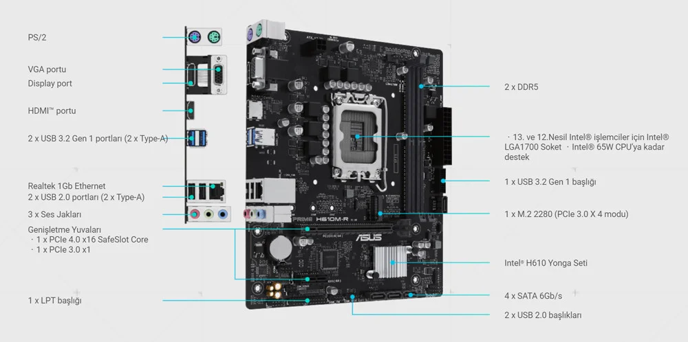 Intel H610 (LGA 1700) micro-ATX DDR5 anakart, PCIe 4.0, M.2 yuvası, Realtek 1 Gb Ethernet, DisplayPort, HDMI, VGA, USB 3.2 Gen 1 portları, SATA 6 Gbps , COM başlığı, LPT başlığı, TPM başlığı- Intel LGA 1700 soket: 12. ve 13.Nesil Intel işlemciler için hazır
