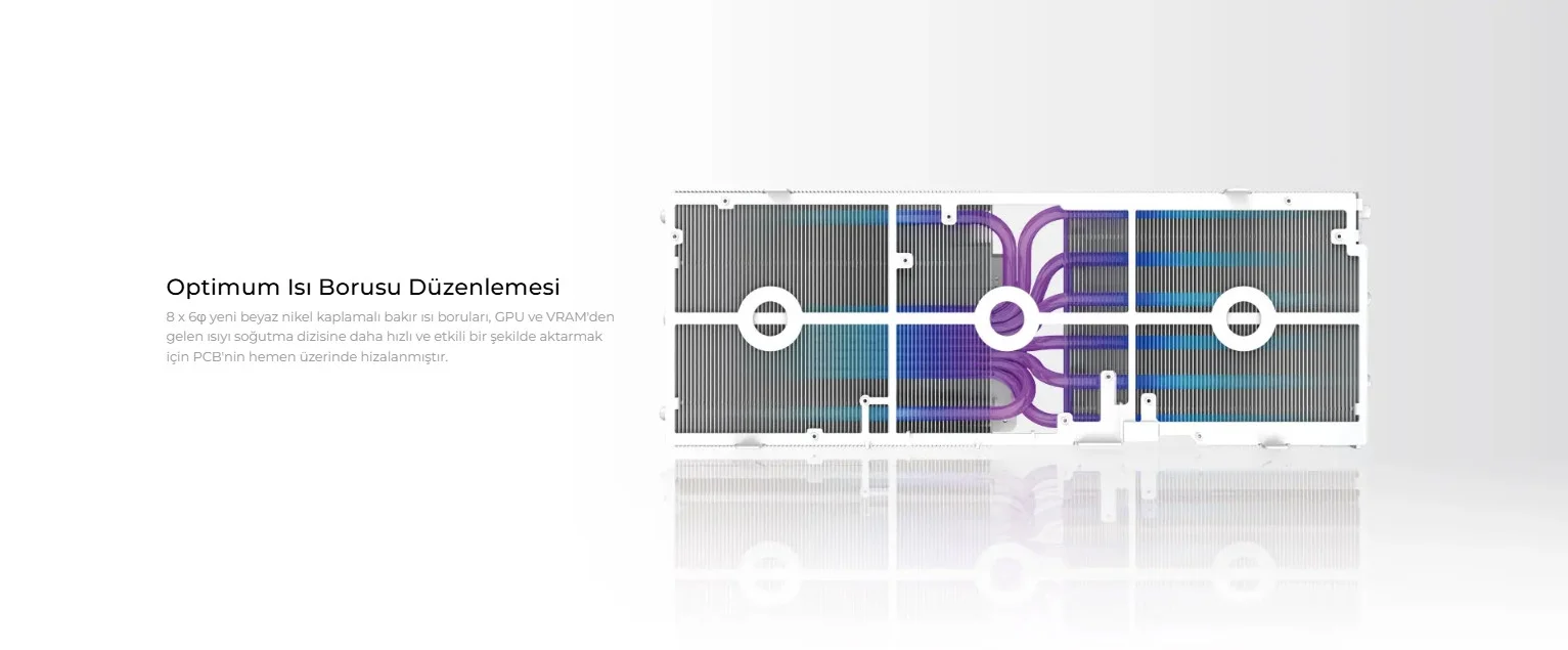 8 x 6φ beyaz nikel kaplamalı bakır ısı boruları, GPU ve VRAM'den gelen ısıyı hızlı ve etkili bir şekilde soğutma dizisine aktarır.